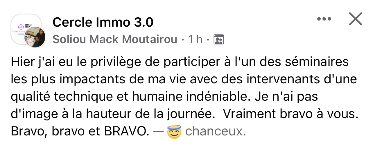 Cercle IMMO 3.0 est le séminaire qui vous donne un socle solide et durable pour vos investissements présents et futurs afin de vous permettre d’avancer vers un avenir plus confiant et d’atteindre la réussite que vous méritez !